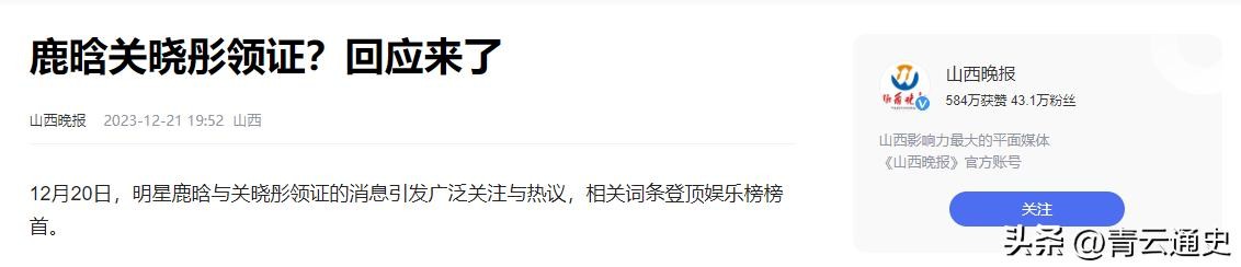 信息来源:2023年12月21日发表于山西晚报——《鹿晗关晓彤领证?回应来了》
