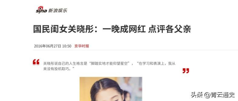信息来源:2016年6月27日发表于新浪娱乐-京华时报——《国民闺女关晓彤:一晚成网红 点评各父亲》