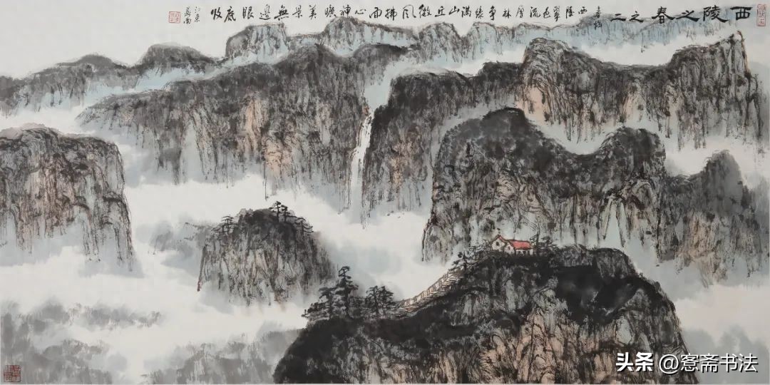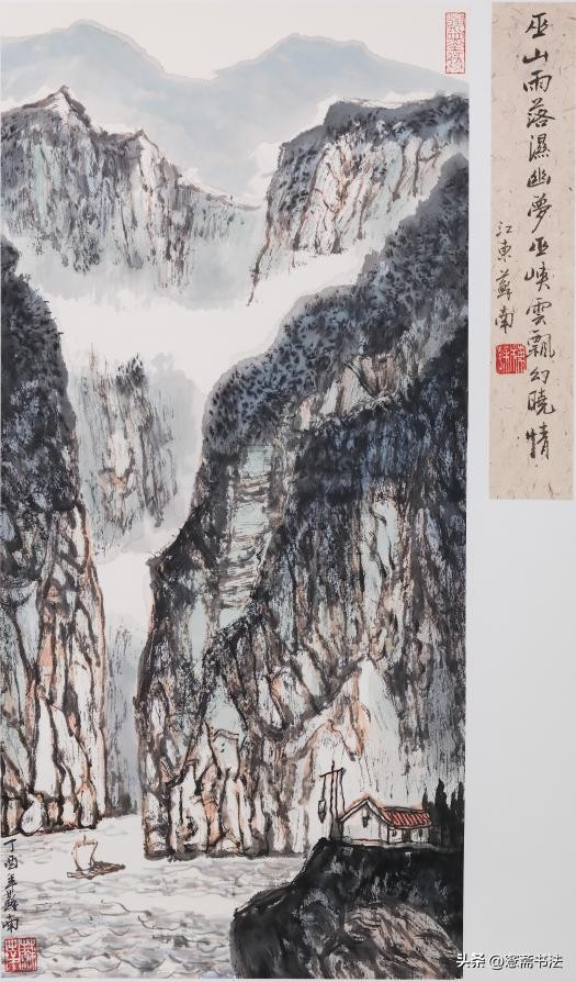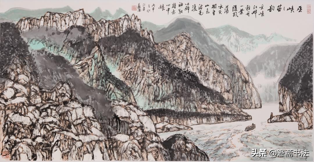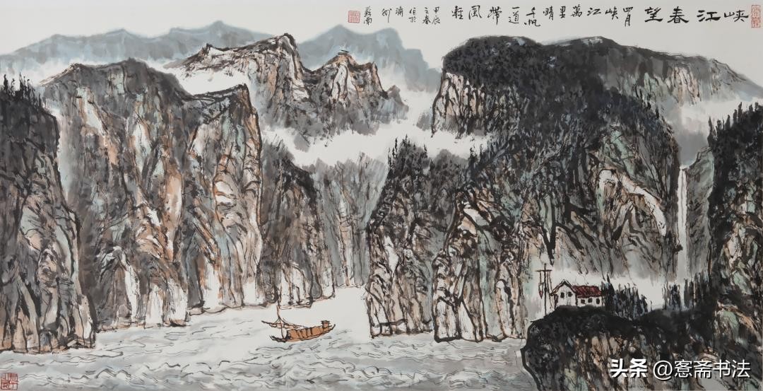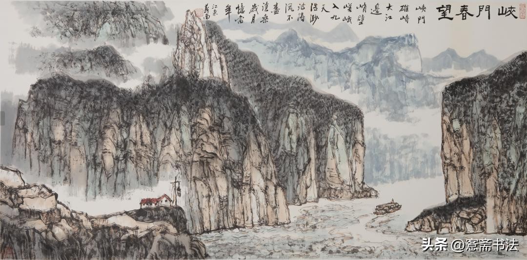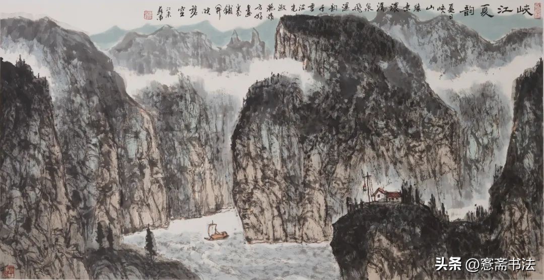 整体画面没有采用西画的色彩,而是用水墨淡彩的形式,将山峡的雄伟壮丽、险峻隽美全部展现,是新时代中国画的典范。