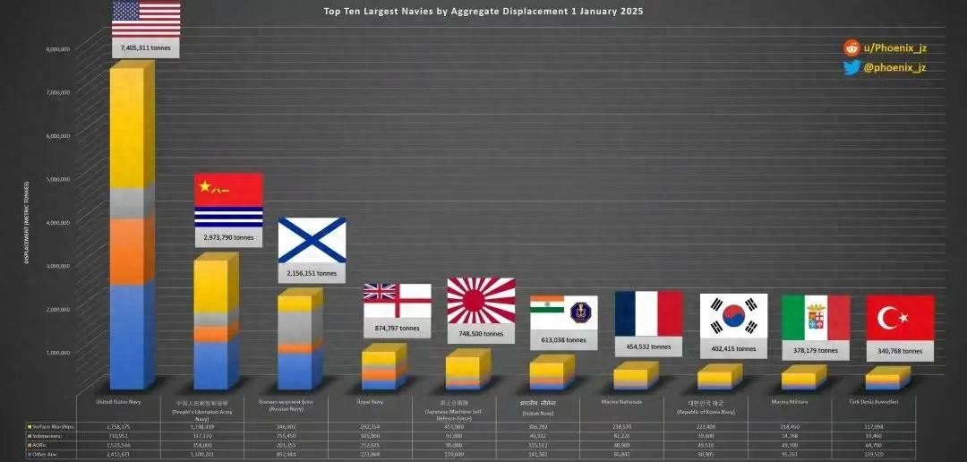 首先,从总吨位这一硬指标来看,美国海军以740万吨的庞大体量遥遥领先,而中国海军则达到了297万吨。这一差距,相当于俄罗斯海军、英国皇家海军与日本海上自卫队之和,其规模之大可见一斑。
