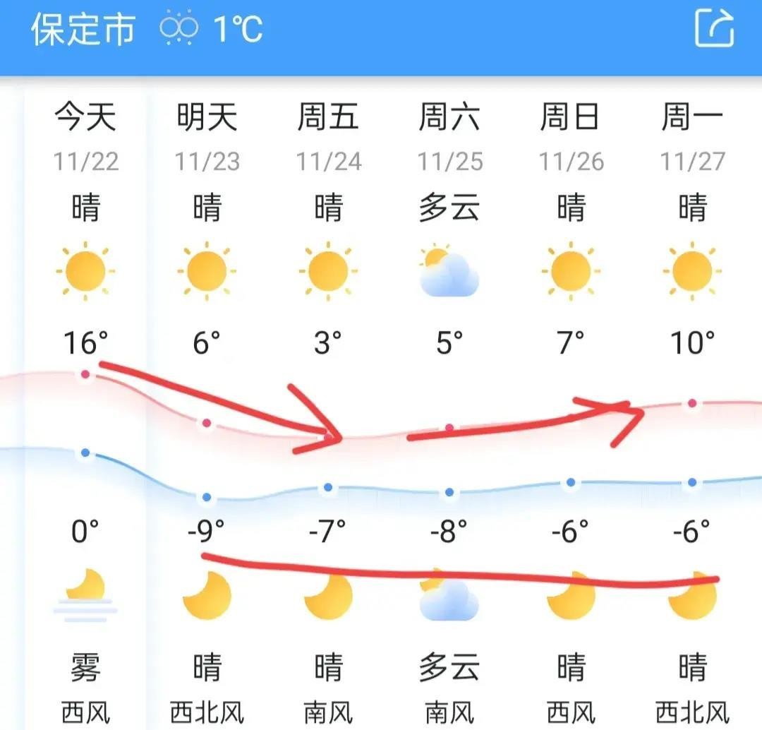 冷空气大作:今天,河北北部就已经开始降温了,从明天起,降温还得持续,预计降温10~15度,够猛嘛!比方说,张家口,今天最高温度5度,明天降到零下8度,降了13度,够猛吧?保定的降温幅度小一些,今天最高16度,后天降到3度,降温13度,正巧气温会回升,不过晚上还是冷冷的,反弹也不会太多。大家记得要多穿点哦!宝宝,冬天来了,你的小脚踝和小手指都有了足够的防寒措施了吗?