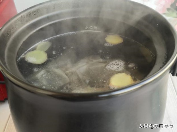 6、骨头放入炖锅里,倒入热水。划重点:一定要热水,也可以事先在炖锅中把水烧好,将焯过水的骨头直接放进去开炖,炖锅最好是砂锅,不要用铁锅;