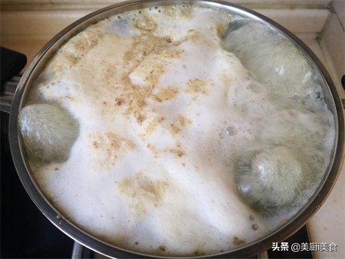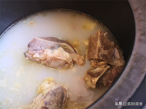 9、划重点:要想把骨头汤熬成奶白色,还有一个关键是要保持锅内高温,所以在炖过程中不要频繁地去开锅盖,不要让热气散走,锅里保持高温才能把成团的脂肪打散变成小颗粒,与水混合在一起,汤才能慢慢变白;
