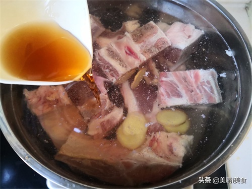 8、锅里倒入一勺料酒,再滴入几滴米醋,加醋是为了让骨头内的钙质更容易析出溶解入汤内,炖锅里的水要一次性加够,不要中途加水,实在是要加也一定要加热水,设置老汤模式,小火慢炖4小时;