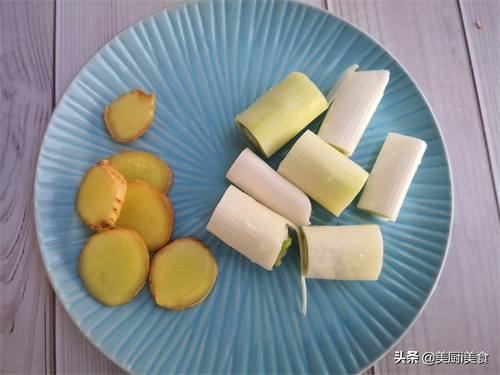 7、生姜切片、大葱切段,一起放进炖锅里,大葱也可以用小葱代替,小葱不用切,打个结放进去即可;
