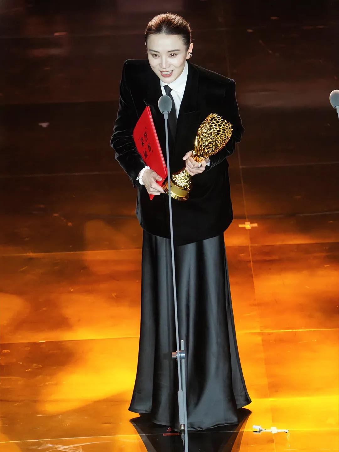 宋佳则以垫肩西装搭配半身长裙的装扮亮相,飒爽中不失柔美。