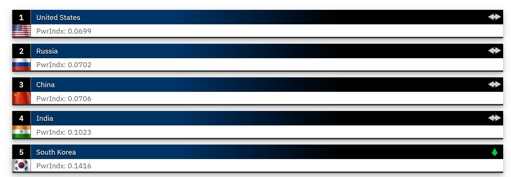 军事实力如何?:根据全球火力指数(GFP)最新审查结果显示,印度目前排在第四位,前五位的其他四个国家依次是第一名美国、第二名俄罗斯、第三名中国和第五名韩国。