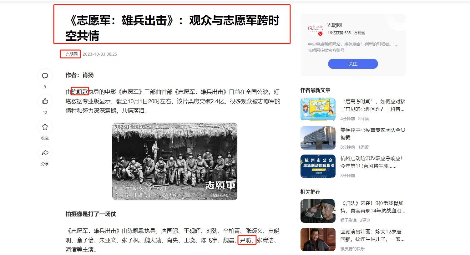 2023年,陈凯歌筹备《志愿军:雄兵出击》时,特意找到尹昉饰演指导员杨少成。