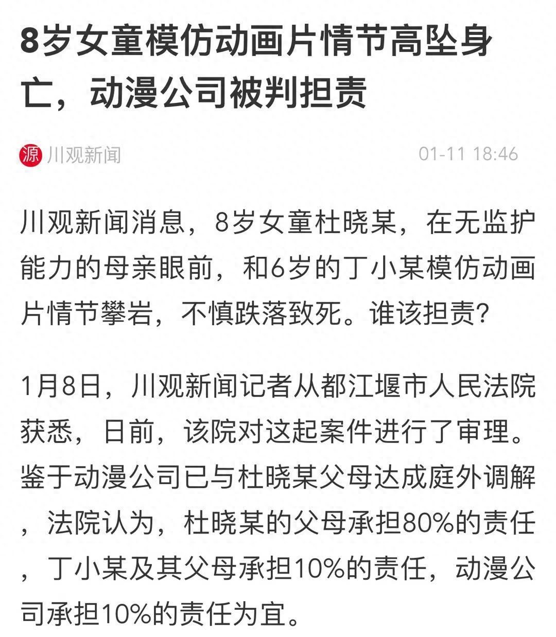 可是有一个8岁的女孩,却因为模仿动画片《熊出没》里的情节,从6楼坠亡。她的家长起诉了动漫公司,最后法院判动漫公司承担10%的责任。