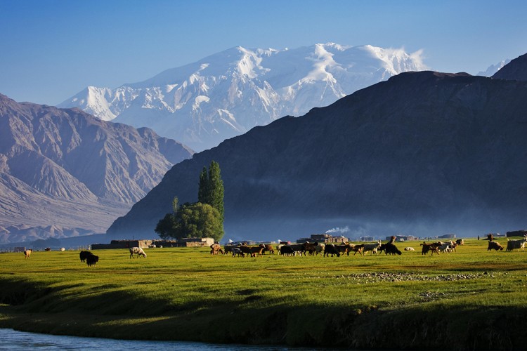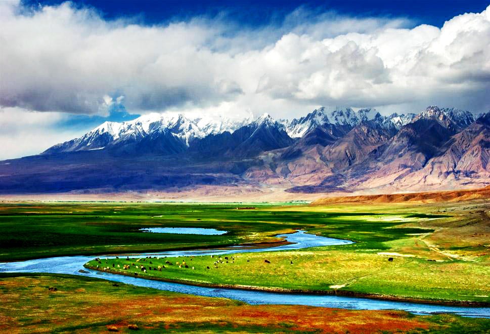 地处丝绸古道上的金草滩,正式名称是帕米尔高原阿拉尔国家湿地公园。塔县的母亲河——塔什库尔干河蜿蜒流淌在湿地中间,河道两侧水草丰美,牛羊遍地。