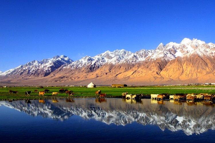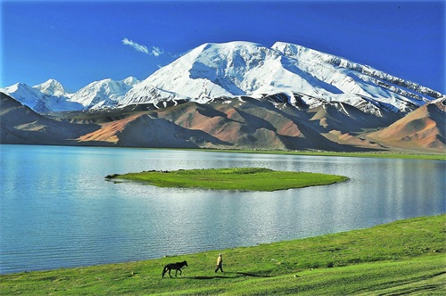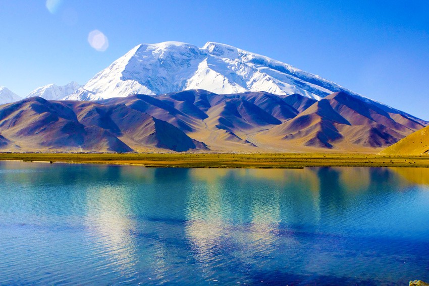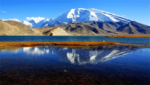 慕士塔格峰与卡拉库里湖仿佛是天作之合,天空如洗,湖水如镜,倒映着白雪皑皑的慕士塔格峰,湖光山色令游客流连。