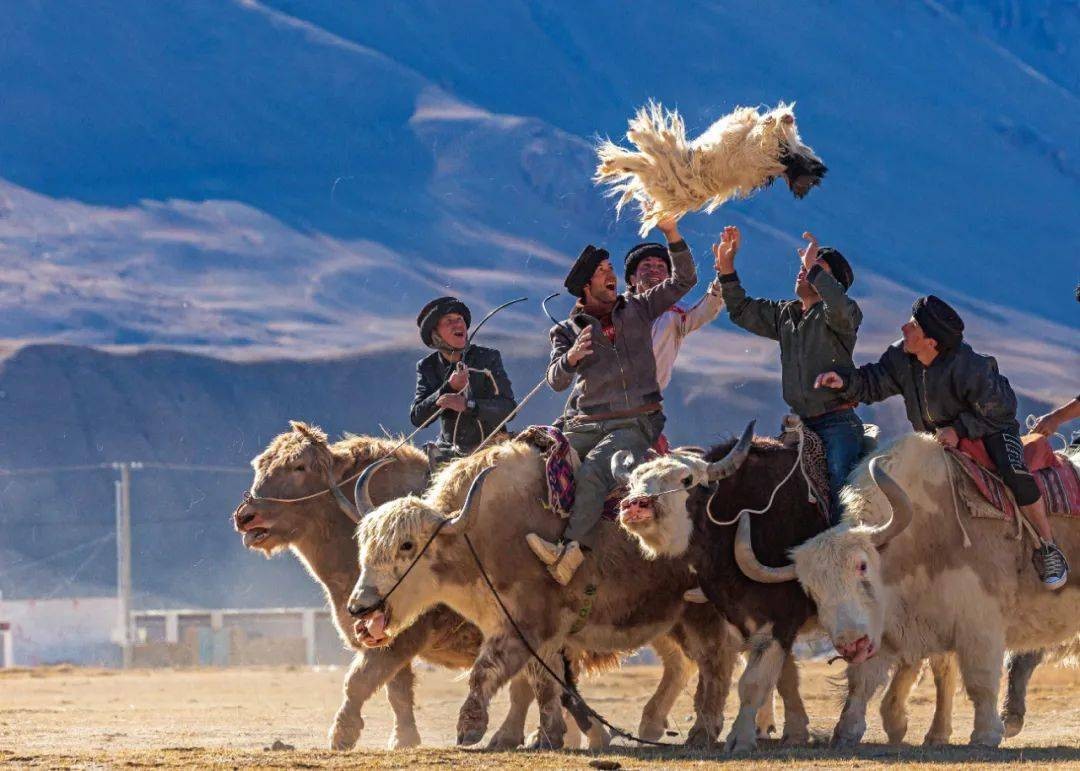 牦牛叼羊是一项富有挑战性的竞技比赛,塔吉克族牧民骑在硕大凶猛的牦牛背上,双方为一只羊而展开激烈的争夺,热闹而又刺激的场面常会吸引成百上千的群众前来观看。