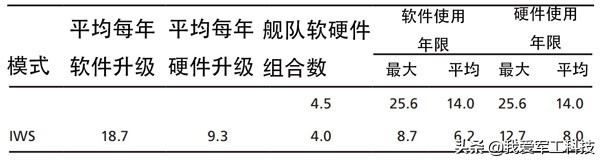 与传统模式相比,IWS模式下宙斯盾系统升级分为软、硬件两部分,每年平均升级舰艇增多,大大降低了每款软件和硬件设备的使用年限(来源:兰德公司报告)