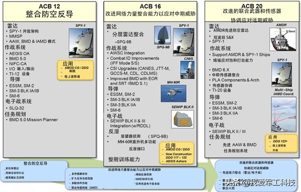 先进能力构建指对宙斯盾系统的软件升级,最早为2008年开展的ACB 08,将7艘服役近20年的“提康德罗加”级CG-52至CG-58从宙斯盾基线2版本升级到基线8.1版本。而ACB 12对应的是宙斯盾基线9,升级覆盖到CG-59至62和“阿利伯克”级驱逐舰FlightⅠ、Ⅱ和ⅡA三型全部28艘上,为宙斯盾系统带来了全方位的提升:
