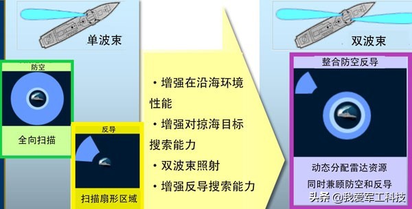 单波束和双波束搜索的对比,绿框内为防空模式,黄框内为反导模式,紫框内为IAMD模式(来源:PEO报告)