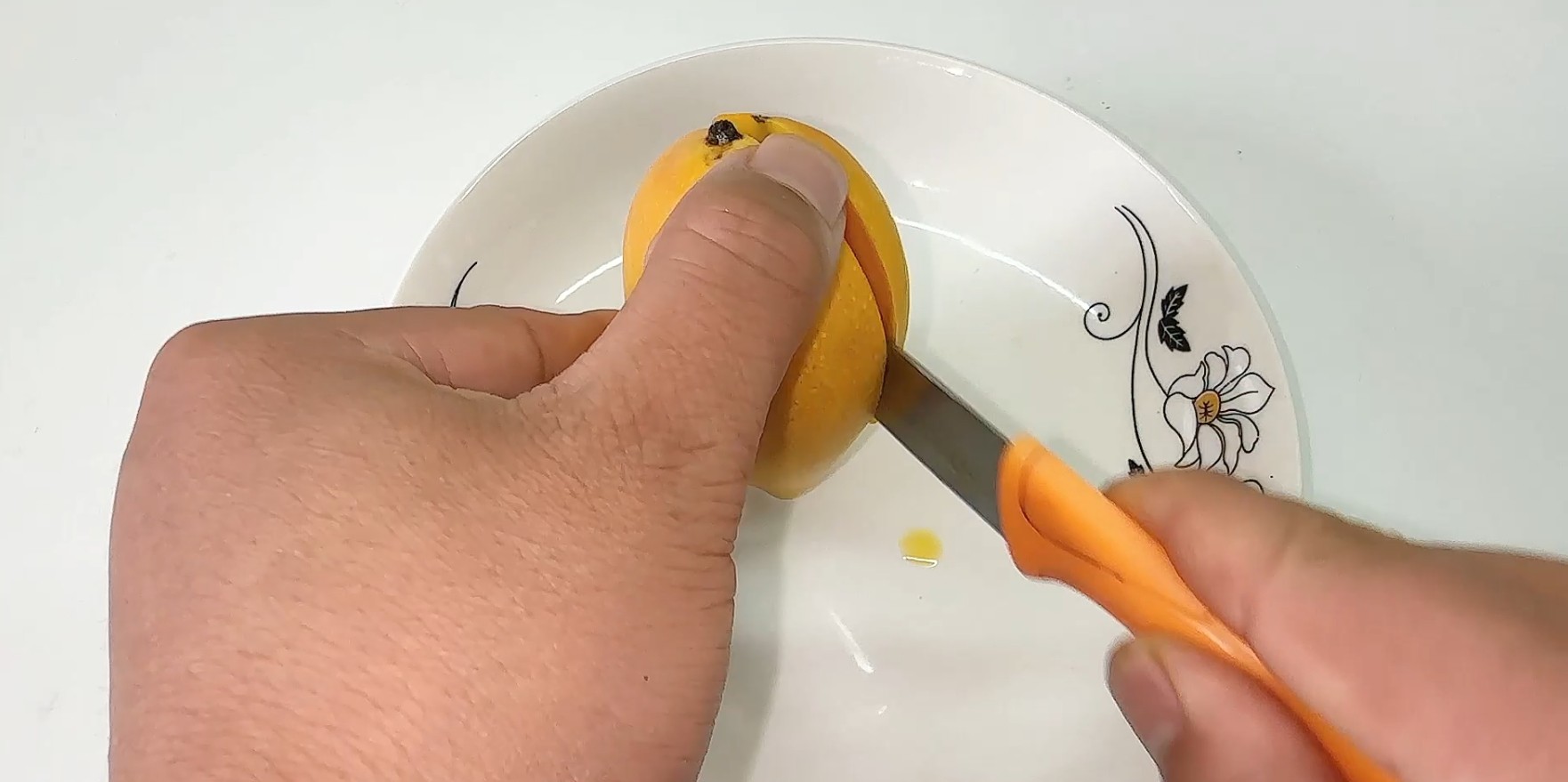 再就是第三个剥芒果皮的小技巧。这个方法非常适合招待朋友用。我们只需要用一个水果刀,沿着芒果中间去切一下,把芒果分成2半就可以了。
