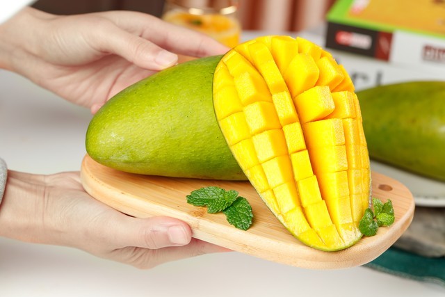 切开一半的芒果。我们再用水果刀在一般的芒果上,竖着划三刀,竖着划完之后,我们接着再横向划几刀,把芒果划完之后,我们就把芒果的两端用手掰一下,这样芒果的果肉都分离出来了,我们去咬着吃或招待朋友是非常好的。还可以用水果刀把果肉再割下来,放到盘中,用牙签叉着吃。一口一块芒果肉,别提有多开心了。