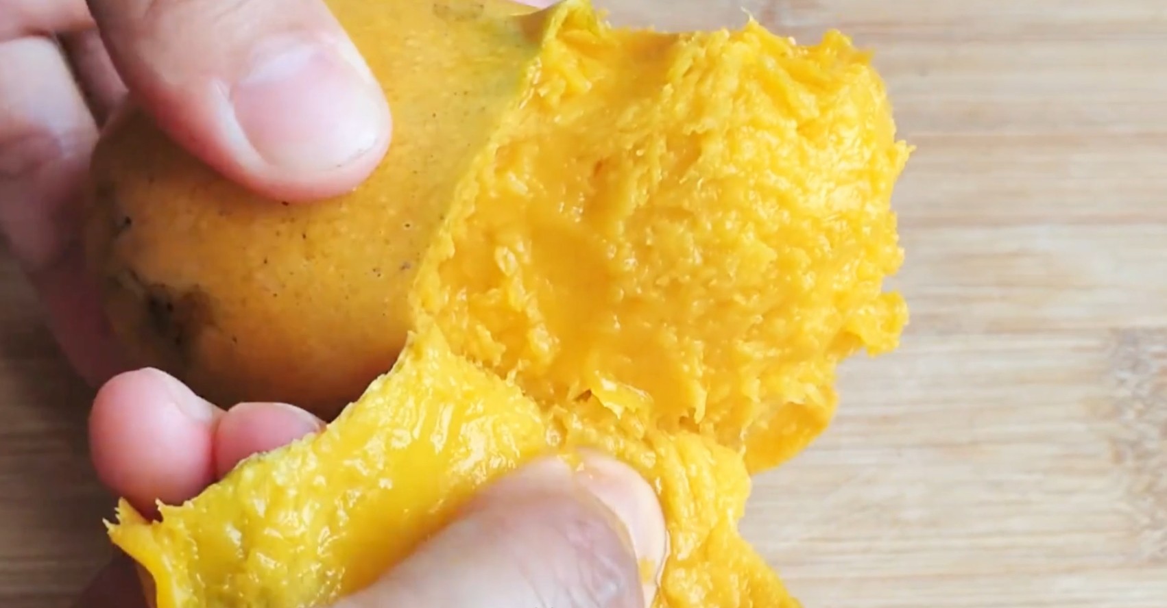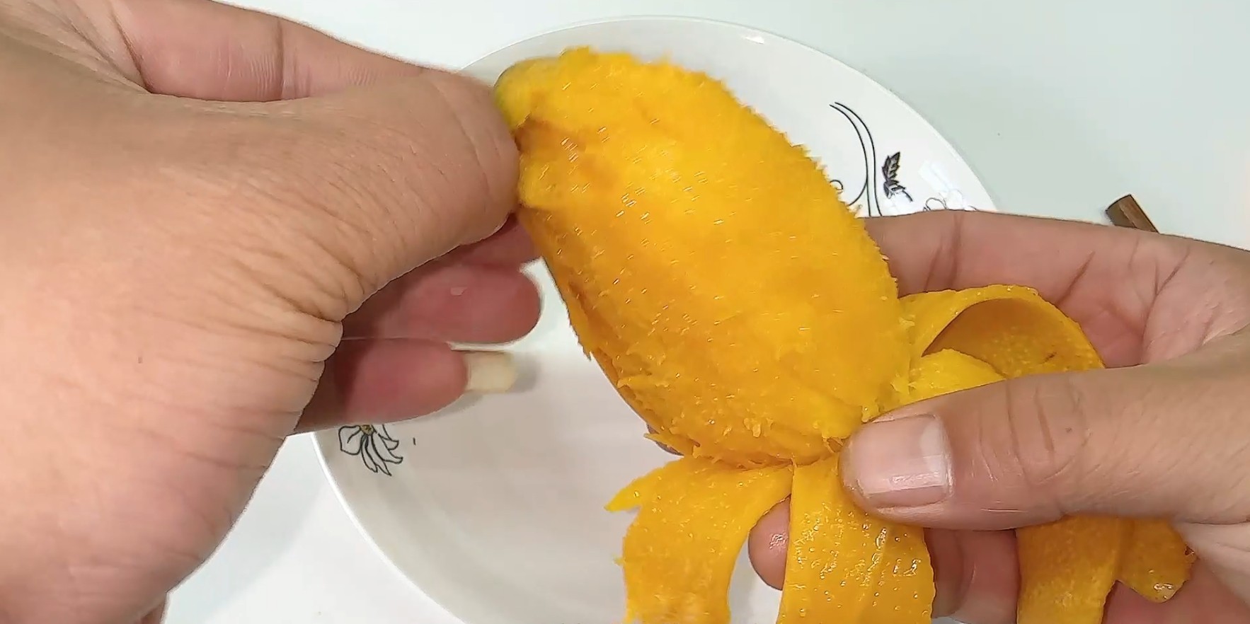 大家看一下是不是剥得非常快,而且剥的非常干净呢?这样剥完芒果之后,我们拿着芒果去吃,也不会吃的身上、脸上有衣服上都是芒果汁了,这个方法是特别简单,特别实用。