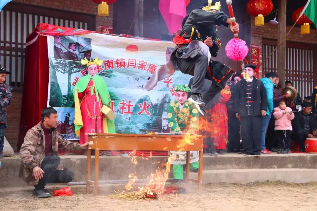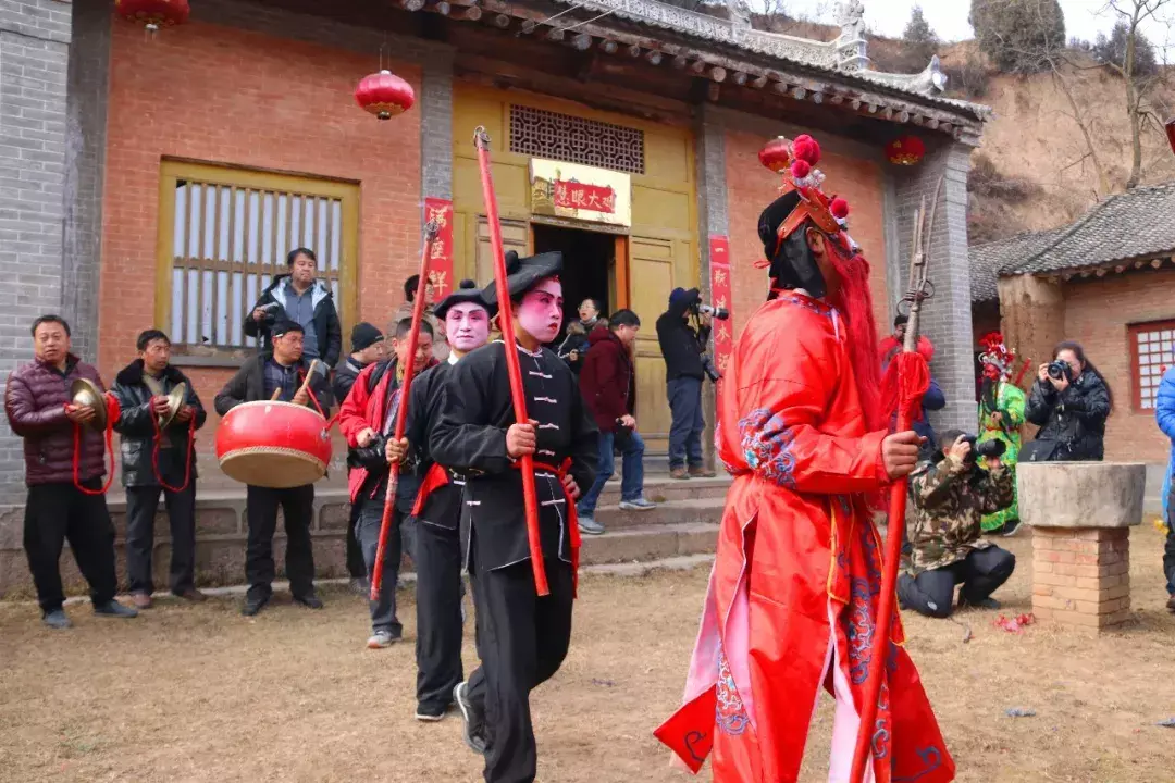 闫家庵村的“血社火”最早从明朝开始,到闫春林这里已是第九代传人。除了组织活动、继承血社火化妆这一传统技艺,他自己也参与到表演当中。据闫春林介绍,现在学社火表演的人很少,没人会耍,所以有时他一个人得扮演几个角色,经常他在第一出戏中演完关羽就得赶紧洗脸再化妆接着演《三打祝家庄》。