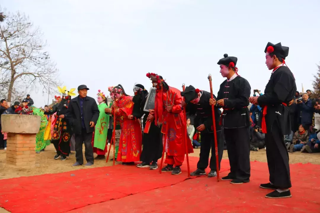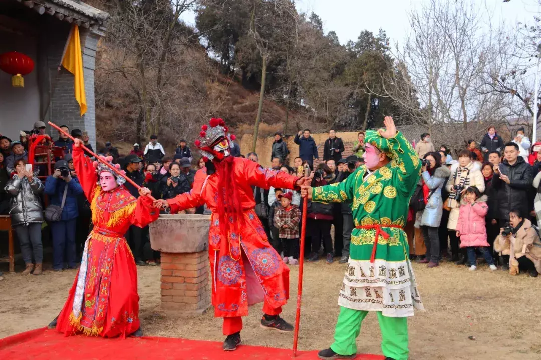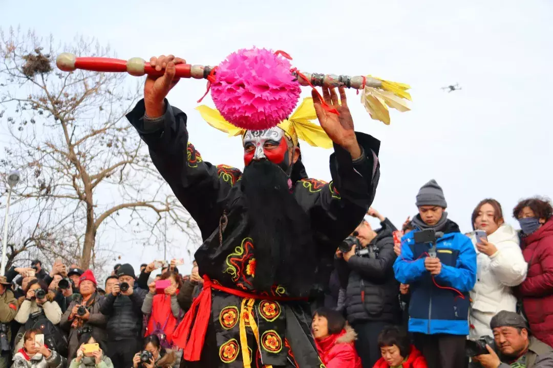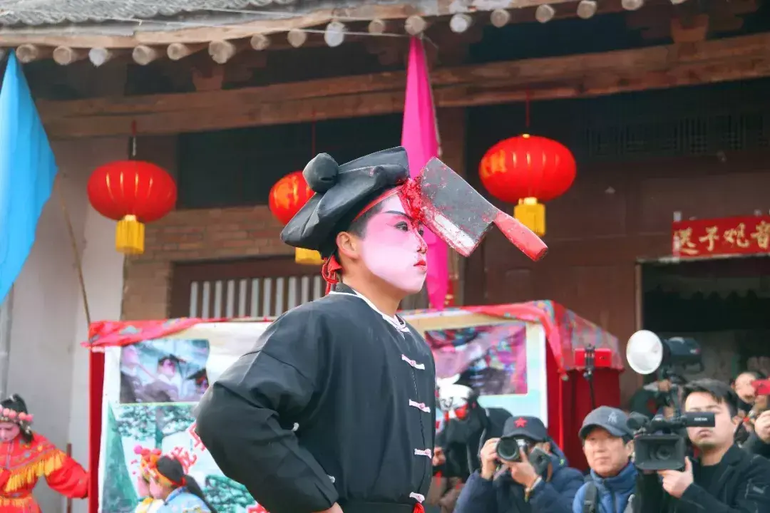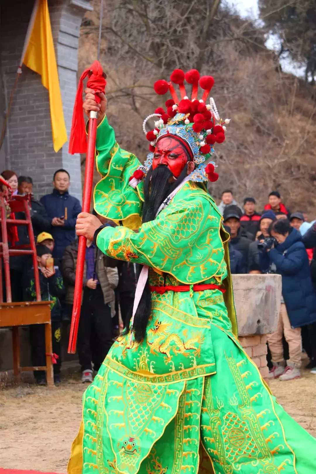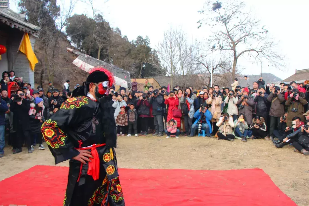 下午四点整,演出正式开始,演员们先在庙宇前进行了祭拜仪式。演出场地被里三层外三层围得水泄不通。有人架起了摄像机录像,有人拿起手机进行直播,天上也飞着几台航拍器,拍照声更是咔咔咔不绝于耳。