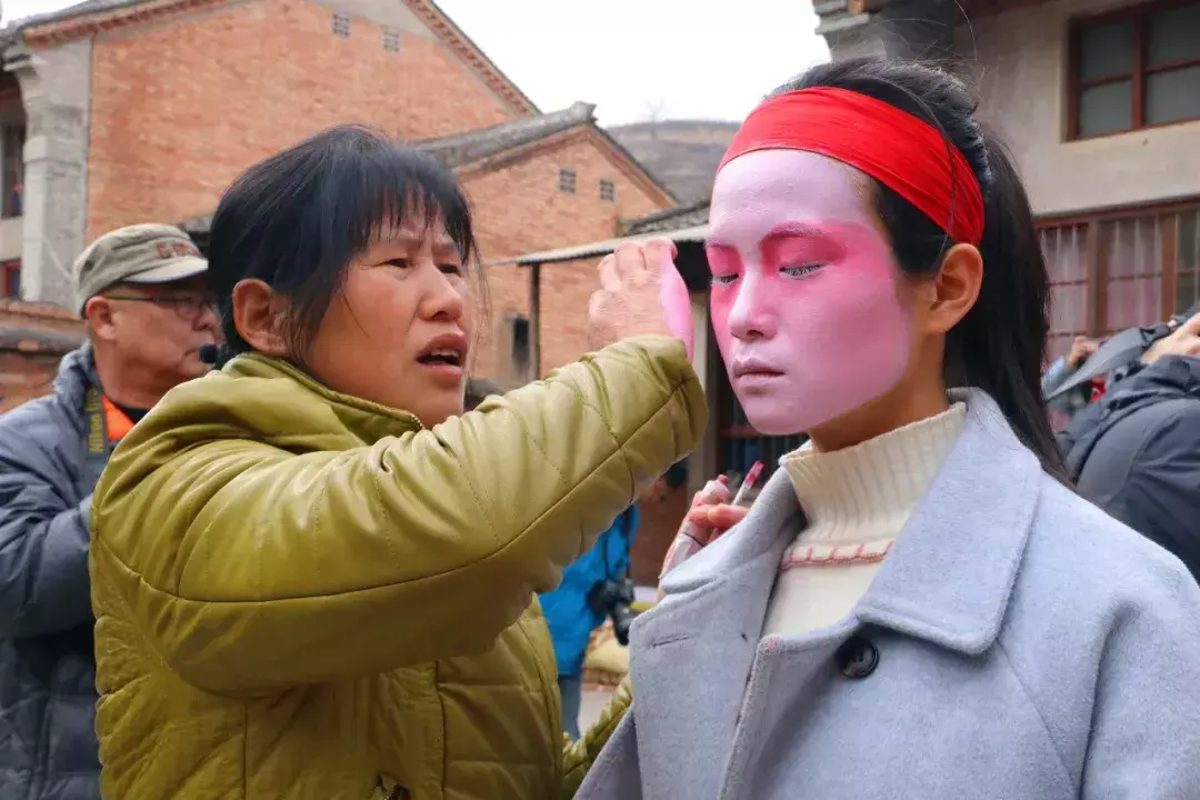 下午一点,笼罩了一早上的浓雾散去,演员们准时来到班主闫春林家化妆,阳光洒在农家小院,暖意融融热闹非凡,大家也开始了“疯狂”的拍摄模式。