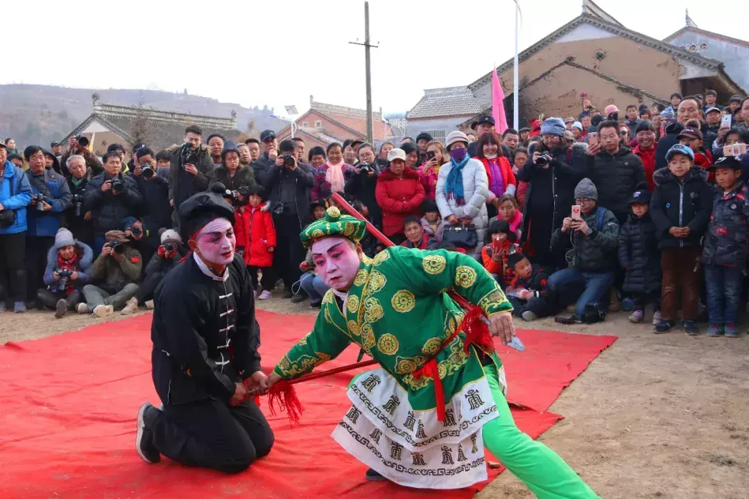 76岁的村民马物力给小编介绍说,他从十七八岁就开始耍社火,演的是《水浒》中的石秀。他的孙子16岁,今天也参加表演。说起现在社火和以前社火的区别,老人家觉得现在的社火不论是演员妆容还是打斗场面都差了些。演了这么多年社火,看的人一年比一年多,以前都是自己村上和周边的村民来看,这么多年过去了,大家都看惯了,反倒是外地人来的多,超级多,有时开车来的人都得把车停到外村走进来。“他们可能觉得很新鲜吧”,老人说。