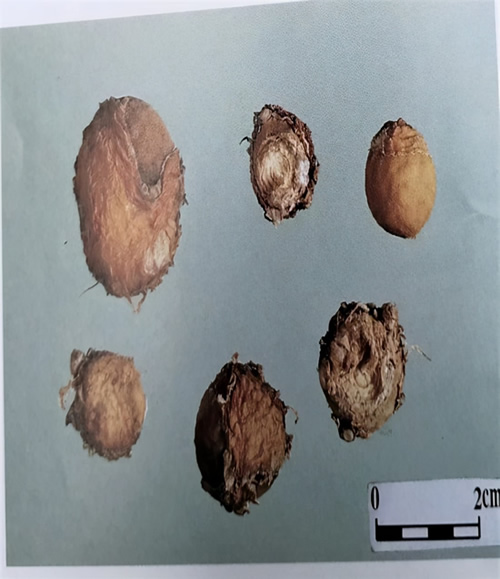 经验鉴别:本品呈扁圆圆球状。直径1.5~3.5cm。表面浅棕色,粗糙,顶端凹陷茎痕较浅,根痕不明显,周边无突出侧芽。