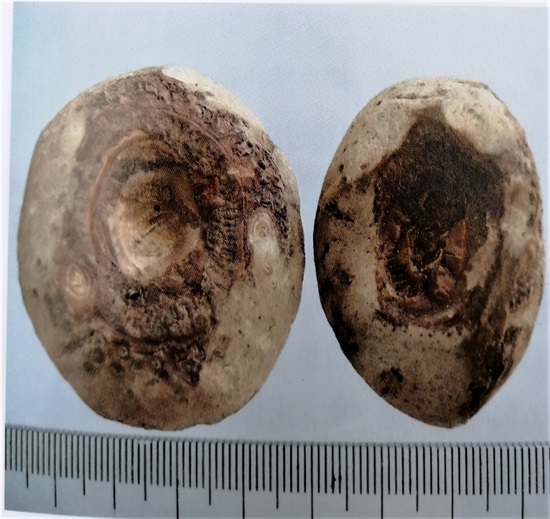 备注:以上三种区别:天南星的顶端茎痕较浅,其周围的须根不大明显,无侧芽;异叶天南星的顶端茎痕深陷,周围1~2圈麻点状须根痕明显;东北天南星的顶端茎痕大而较浅,麻点根痕细而不整齐,周围可见细小的侧芽。