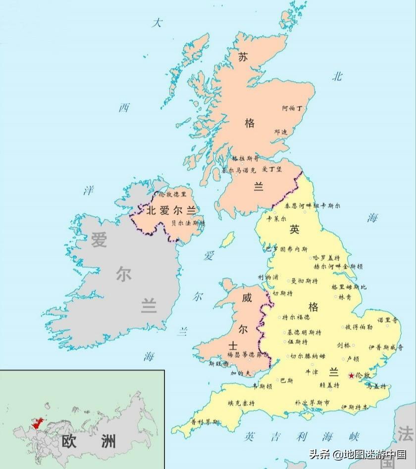 英国的全称是大不列颠和北爱尔兰联合王国,位于欧洲西部的北大西洋上,与欧洲大陆隔着英吉利海峡,主体位于大不列颠岛上,分为苏格兰、英格兰和威尔士三部分,另外还占据爱尔兰岛的东北部极其周围近海的附属岛屿。