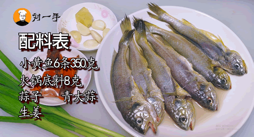 小黄鱼6条350克、火锅底料8克、蒜子、青大蒜、生姜